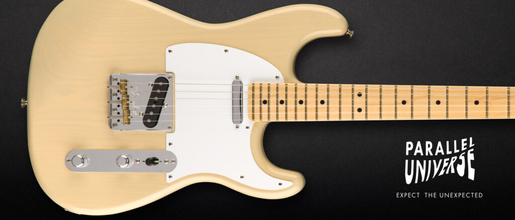 ボディシェイプはテレだけど、ピックガード形状やボディ・コンター、ヘッドはストラトという、近頃はあるっちゃあるギターですが、これはなんと本家フェンダー製、しかもマスタービルダーのクリス・フレミングが造った限定100本のレアなギターです。2018年に「Parallel Universe」コレクションというのが出ましたが、たぶんその元祖です。